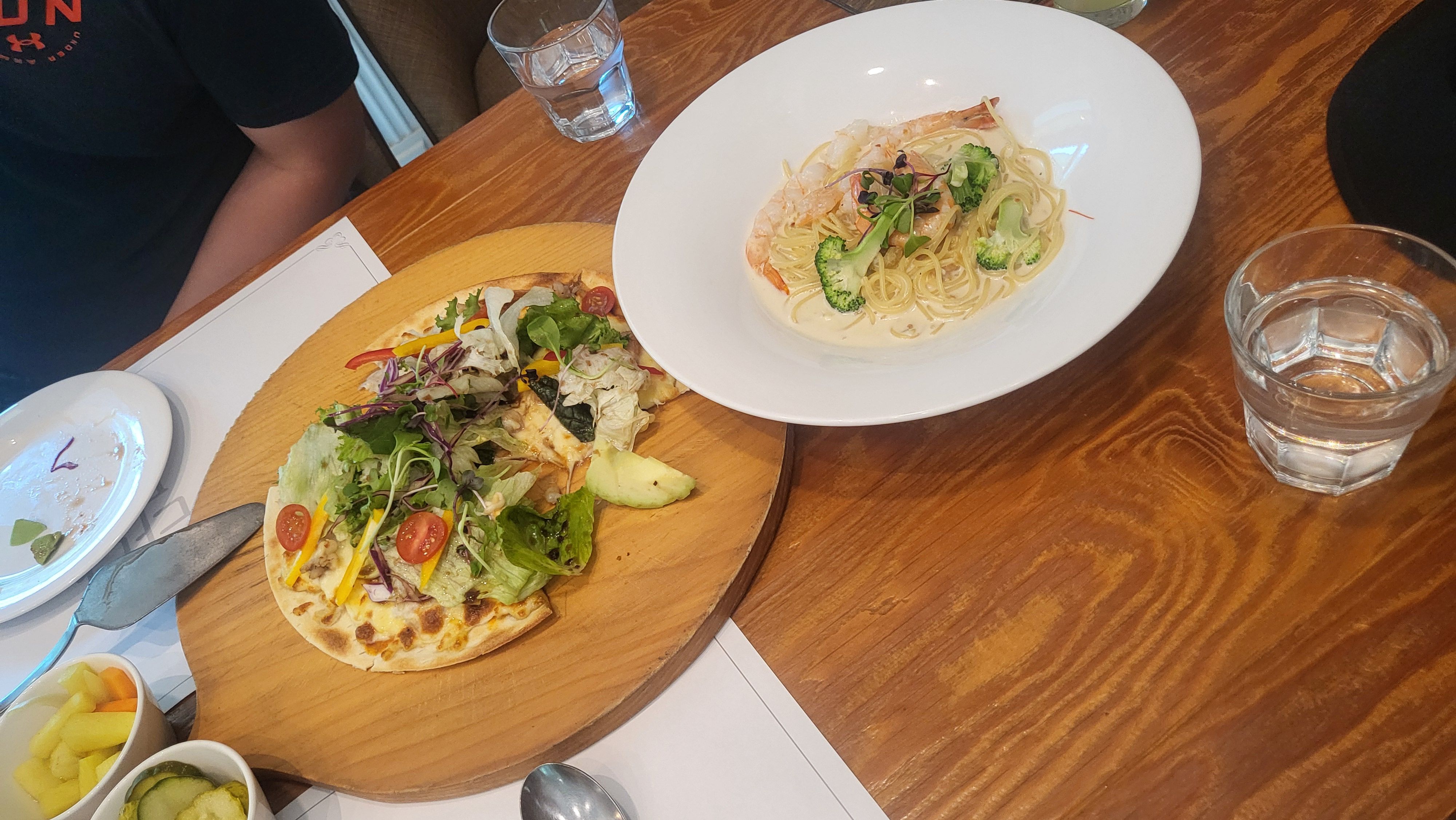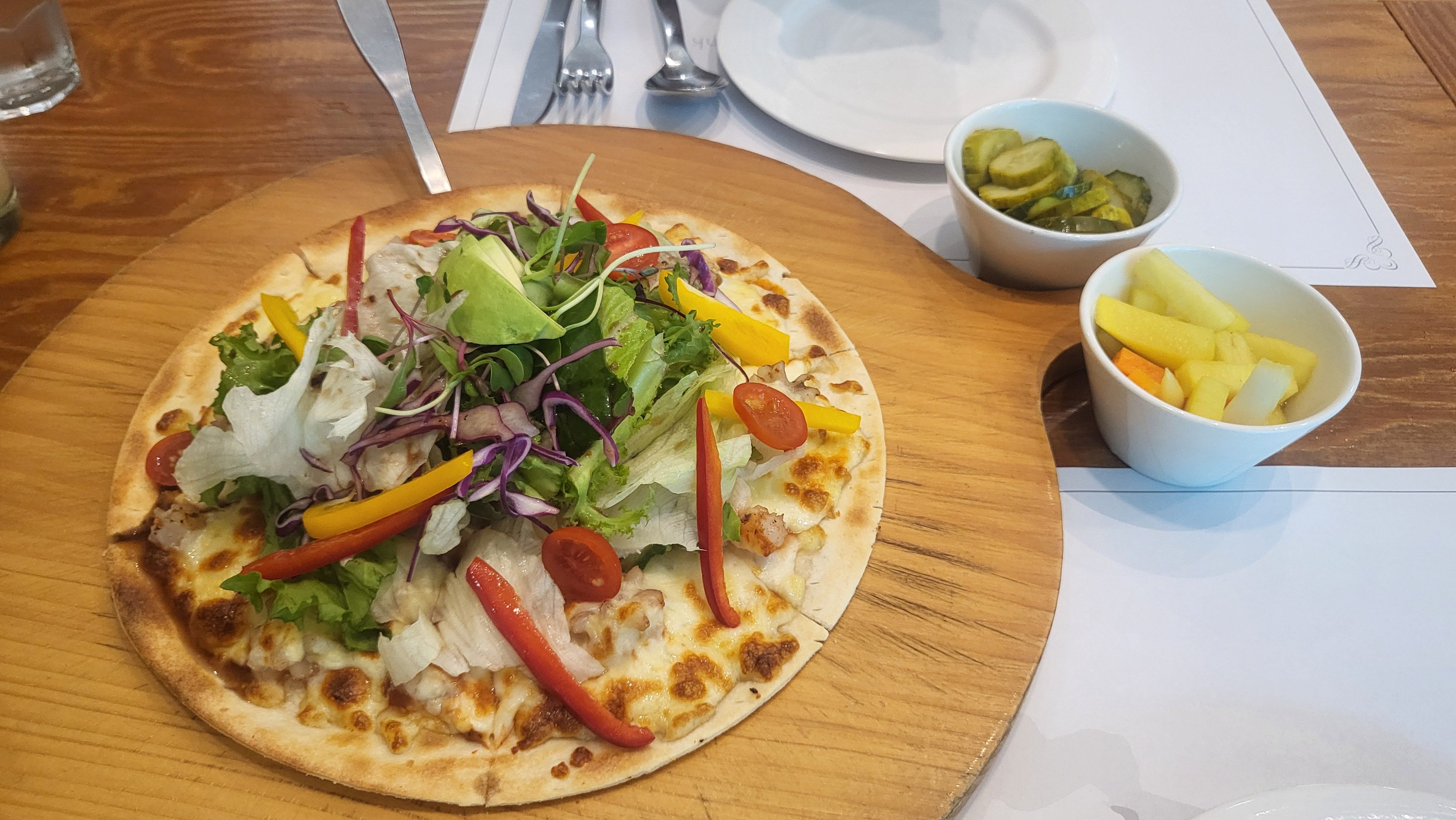우선, 첫 번째 사진에서 보이는 샐러드 피자! 도우 위에 신선한 채소와 과일들이 듬뿍 올라가 있어서 아주 상큼하고 가벼운 맛이었어요. 피클과 절임채소도 함께 나왔는데, 피자의 느끼함을 잡아주기에 딱 좋았어요.